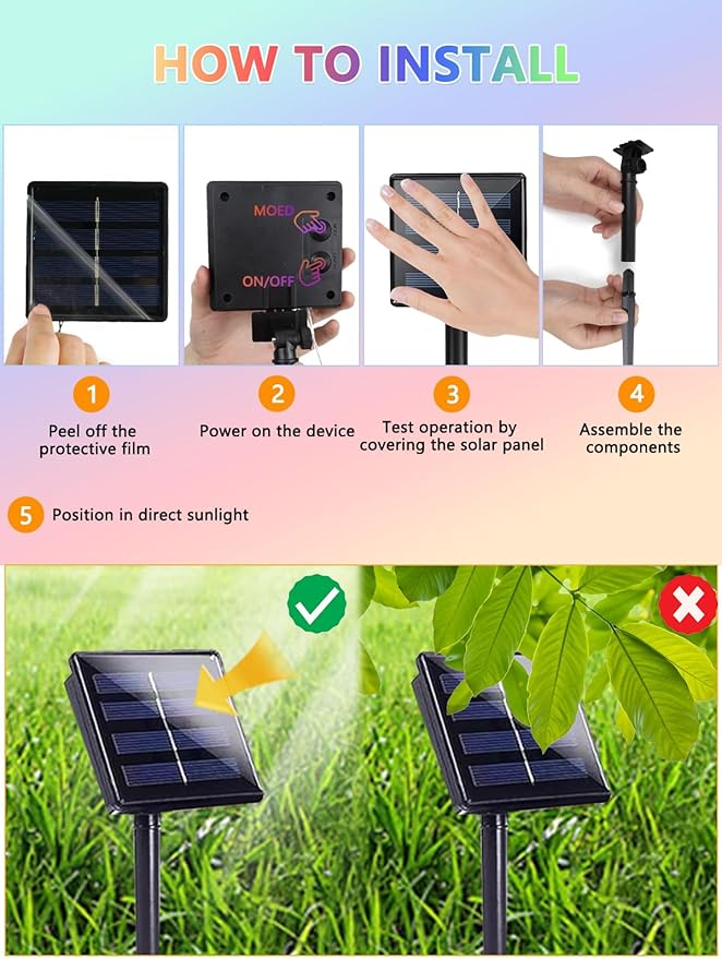- Waterproof Solar Tree Lights and Easy to Install: With an IP65 waterproof design, the solar powered Christmas lights can withstand all kinds of weather and are a great choice for outdoor decorations, such as porch, roof, tree, yard and fence. And the lights can be installed easily—simply attach the ground stake to the solar panel and place it in a sunny spot