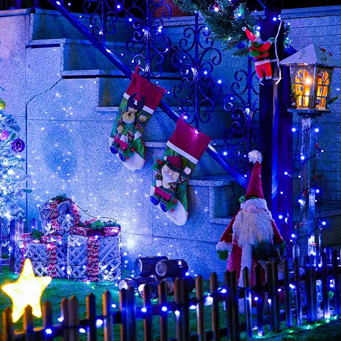 - 8 MAGICAL MODES & AUTO TIMER: Customize your Christmas atmosphere with 8 beautiful lighting modes. Choose from gentle pulses, festive combinations, warm glows, cheerful twinkles, rolling waves, chasing patterns, sequential flows, and steady light. These blue string lights also feature a smart timer that automatically manages operation—simply long-press for 3 seconds to set 6 hours of illumination followed by 18 hours off.