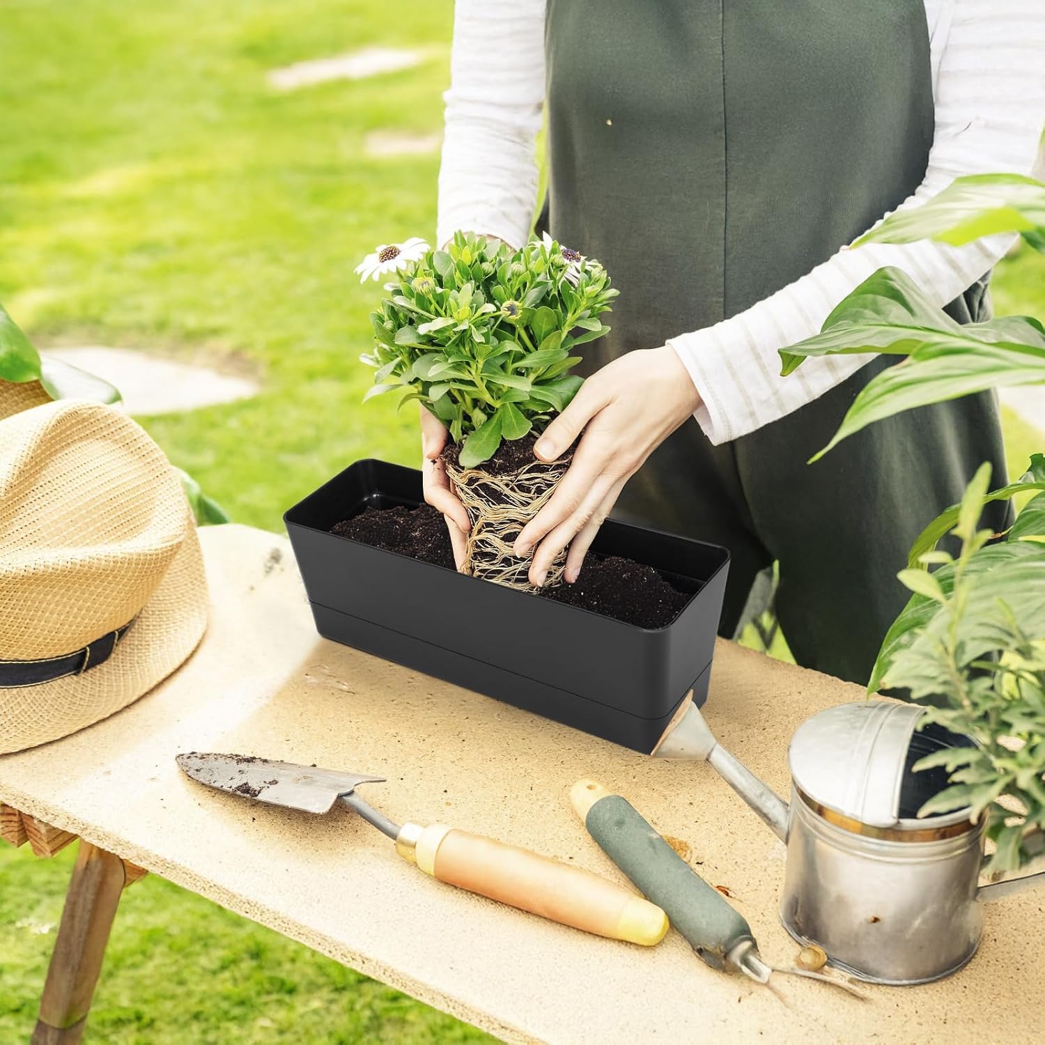 GREANER 6 Pack Herb Planters, 12x3.8 Inch Black Rectangle Window Boxes with Tray, Indoor Succulent Cactus Mint Plastic Pot for Windowsill, Balcony, Office, Outdoor Garden