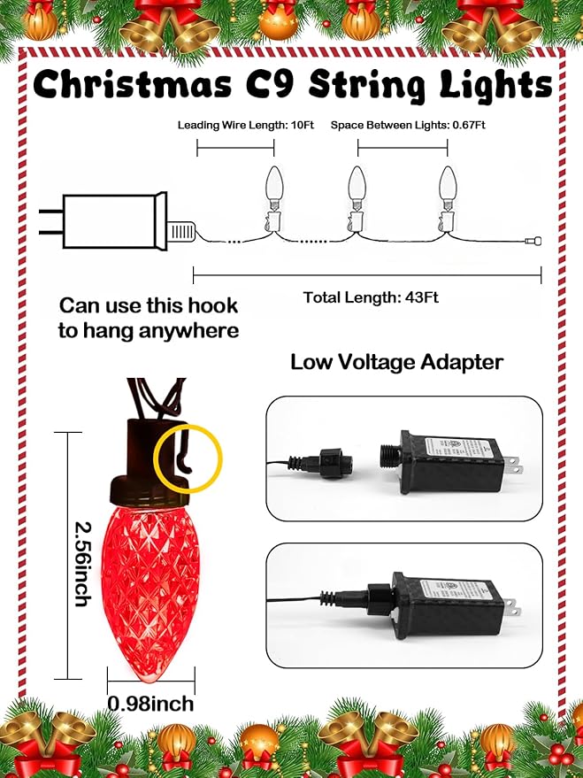 - Extendable & Safer Design: These C9 Christmas string lights are equipped with a 29V low-voltage plug and are ETL certified for safe use. You can connect and extend up to 4 sets together, making them ideal for decorating larger outdoor spaces or wide areas. Plus, the 10 ft leading wire provides added flexibility for outdoor setup and placement