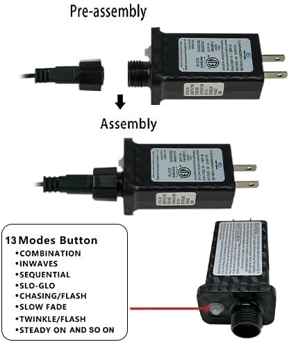 - 8 Modes & Multiple Choice: Press the button on the transformer to choose from the 8 different light effects: Combination, In Waves, Sequential, Slo-glo, Chasing/Flash, Slow Fade, Twinkle/Flash, and Stay On. Switch modes on demand, rich choice for you to create a beautiful and gorgeous festive atmosphere.