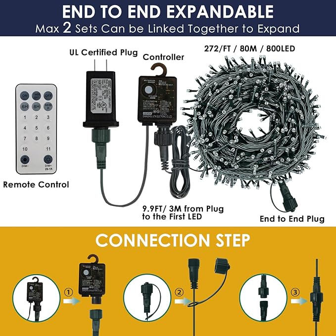 - 272ft Super Long Colors Changing String Lights - Our 800led 272ft colored string lights was super long enough for large area decorations. It was powered by 29V low voltage UL certified plug, safer to use when decorate your holiday party.
