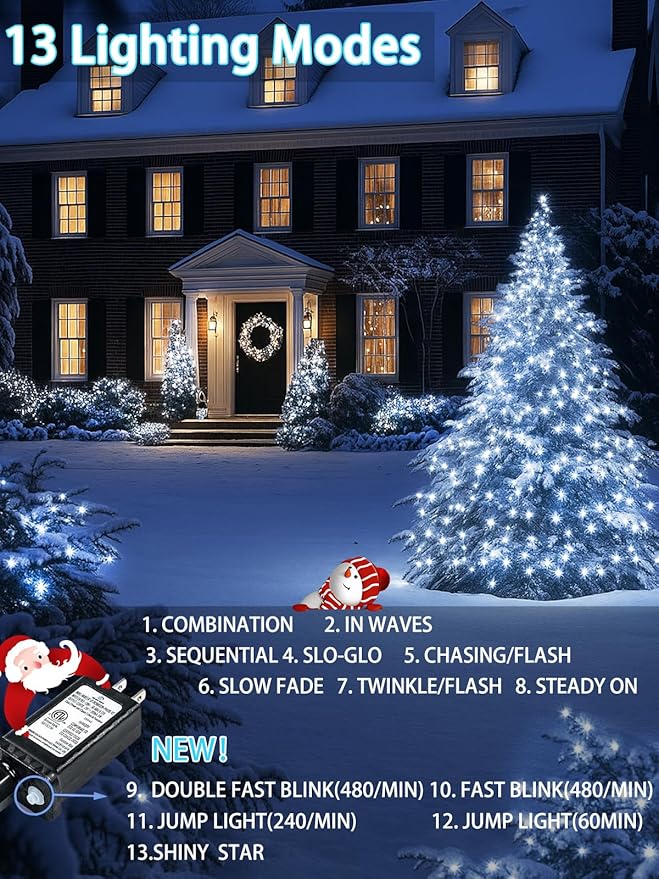 - New Upgraded 13 Lighting Modes: These Cool White Christmas lights offer 13 dynamic modes: comb, in waves, sequential, slo-glo, chasing/flash, fade, twinkle/flash, steady on, double fast blink(480/min), fast blink(480/min), jump light(240/min), jump light(60/min), shiny star. Perfect for different occasions, moods, holidays, anniversaries, and more. Easily adjust the lighting modes by pressing the button on the adapter to set your preferred style