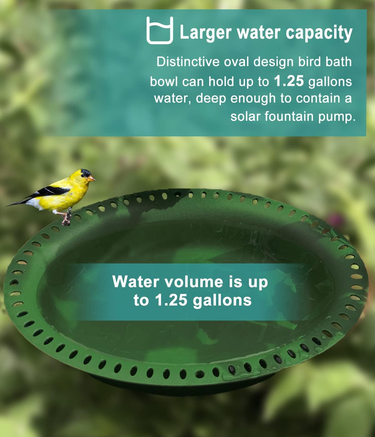 - More capacity & Oblong shape: This extra-large bird bath has an OBLONG tray with small holes along the edges, providing a stable standing and resting environment for the lovely bird friends. Bird friendly color--Green color basin is gentle and unobtrusive in your outside areas, and deep enough for contain a solar fountain pump. (Bowl dimension: 17.2โ L ร 13.2โ W, bowl depth: 2.76 inches.)