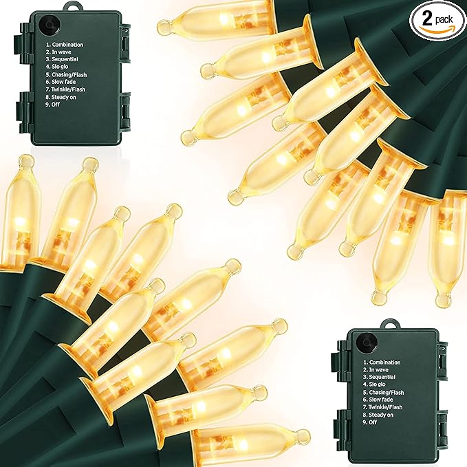 - LED Bulbs Mini Christmas Light: Warm White 2 Pack 50 LED bulb cone shape reflects light in all directions creating a spectacular halo of light. Great choice that allows maximum flexibility and great eye appeal. String Lights: 16ft, Leading Wire: 1ft, the total length of each battery powered string lights is 17ft