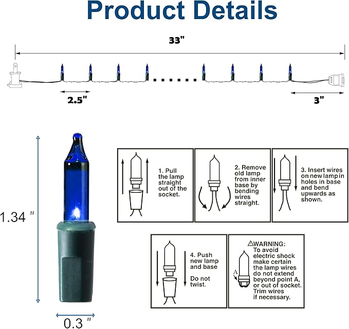 - Outdoor Christmas Mini Lights: Decorate with 150 LED blue incandescent mini lights will give a soft festive feel to your Christmas. These beautiful string lights bulb space 2.5 inch, 2.5V and 0.42W per bulbs, built-in 3A fuse for safe use.