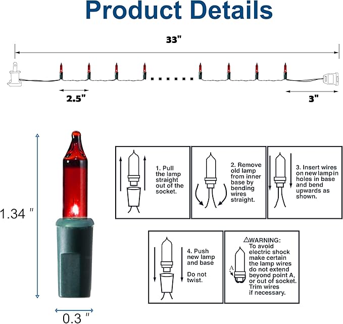 - Package include: 1 x 33 ft string light, 1 x spare fuse, 4 x extra incandescent light bulbs. The length of Christmas mini string lights is 31 FT, and the leading wire is 2 ft.