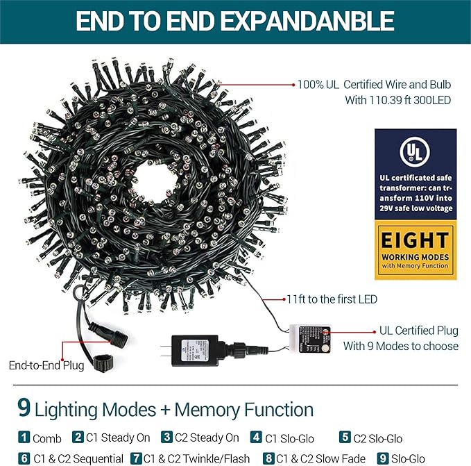 - End To End Connectable & 9 Lighting Modes: Each fairy light comes with an end-to-end plug, which makes you can connect max 3 sets together. Each one length is 108 feet with 300 LEDS(99ft first led to last led + 9ft extension cord), the max expandable length is 324 feet with 900 LEDS. With 9 Working Modes: 2 Colors Combination, Multi-color Steady On, Warm White Steady On, Multi-color Slo-glo, Warm White Slo-glo, 2 Colors Sequential, 2 Color Twinkle/flash, 2 Colors Slow Fade, 2 Colors Slo-glo.