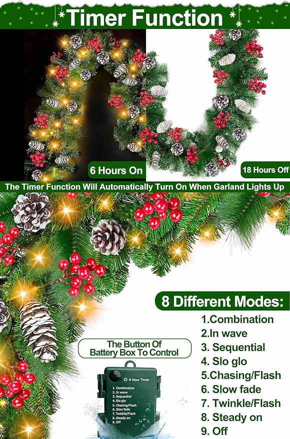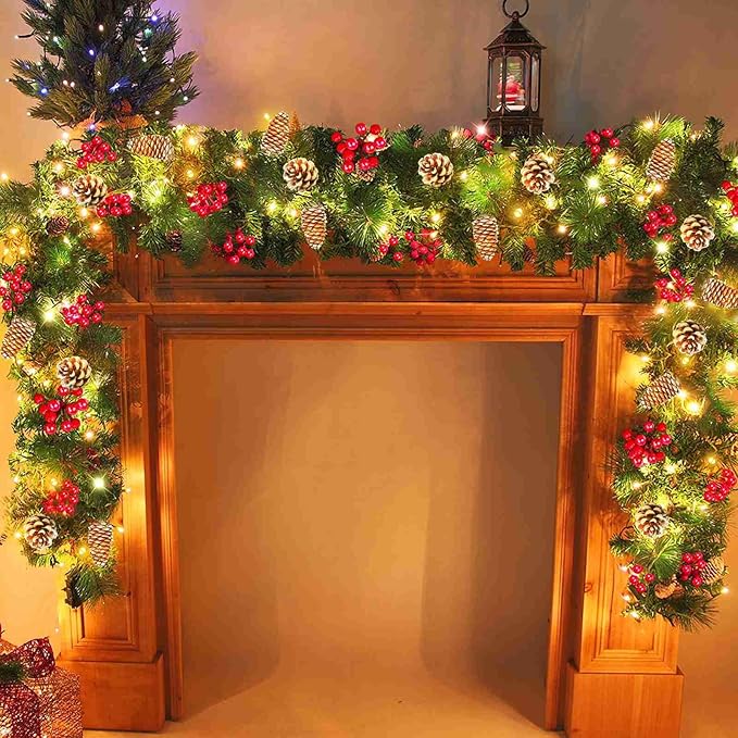 Timer & 8 Modes-9 Ft by 10 Inch Christmas Garland Decorations 50 Warm White Lights Lighted 270 Branch 70 Red Berries 10 Pinecone Mantle Xmas Garland Christmas Decor