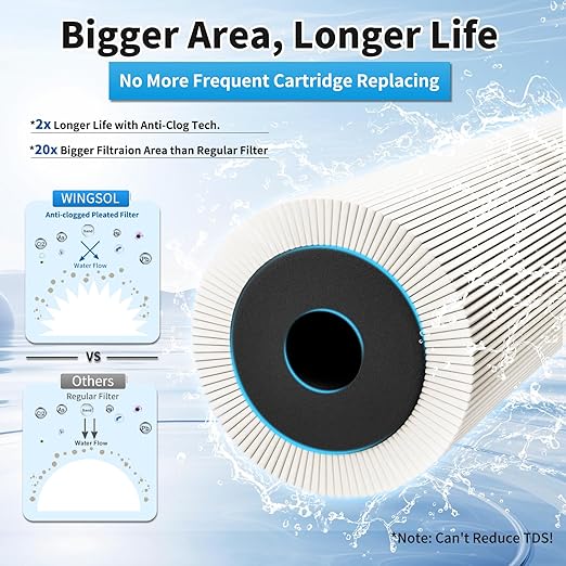 - [Anti-Clogged]: 0.2μm anti-clogged pleated filter, bigger capacity longer life; 8K gallons cartridge life, 1.5 gallons/min water flow