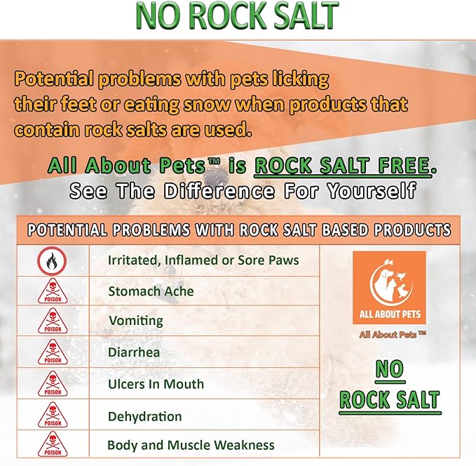 - NO SHARP ROCK SALT, SALT-FREE - Walking On Rock Salt Can Be Excruciating To Your Pets Feet; Sharp Rock Salt Granules Can Become Stuck & Lodged In Paws Causing Pain & Soreness With Every Step; Not Only Does All About Pets Not Contain Rock Salt, Our Ice Melt Consists Of Soft Round Pellets That Are Easy On The Paws And Two Times The Coverage Of Rock Salt