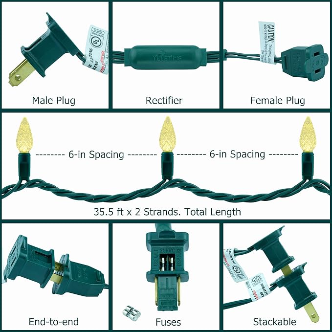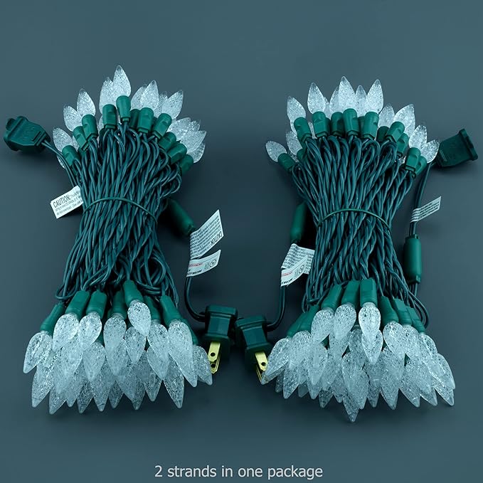 - 2 Strands In 1 Pack ♥ 140 count warm white C6 Strawberry LED bulbs on green wire, 71 ft. total length. 2 strands of 70 lights in one package. 35.5-feet per strand, 6-inch spacing, 6-inch lead, 6-inch tail. It can be used with an end-to-end connection or two separate connections as needed.