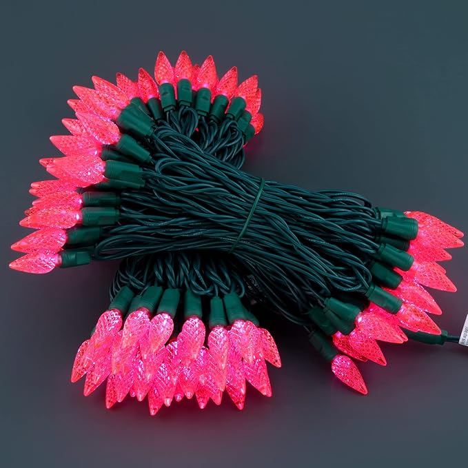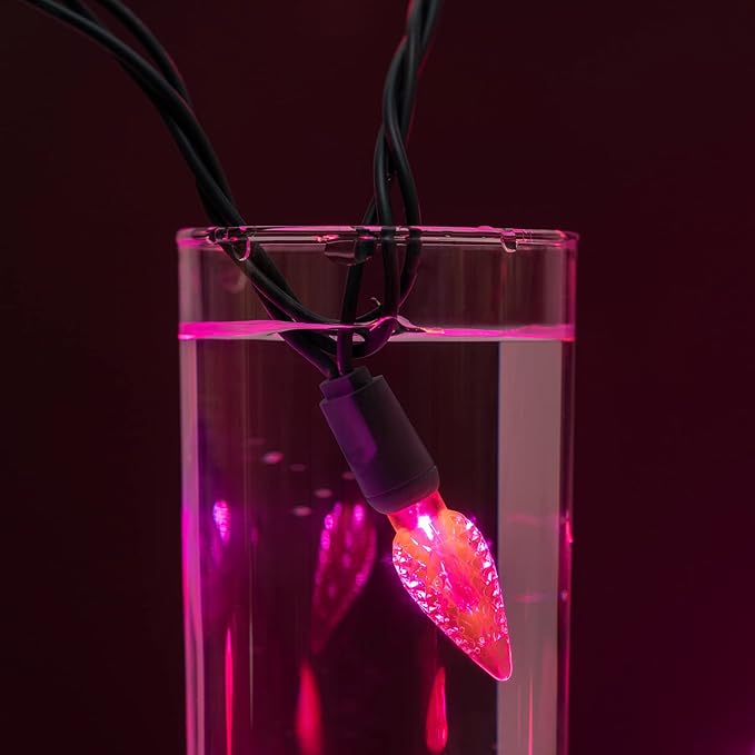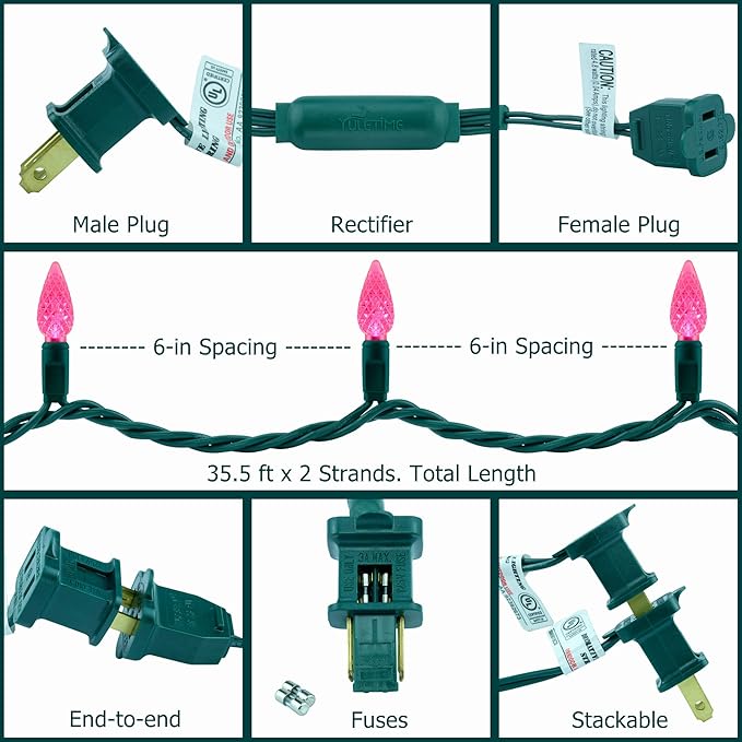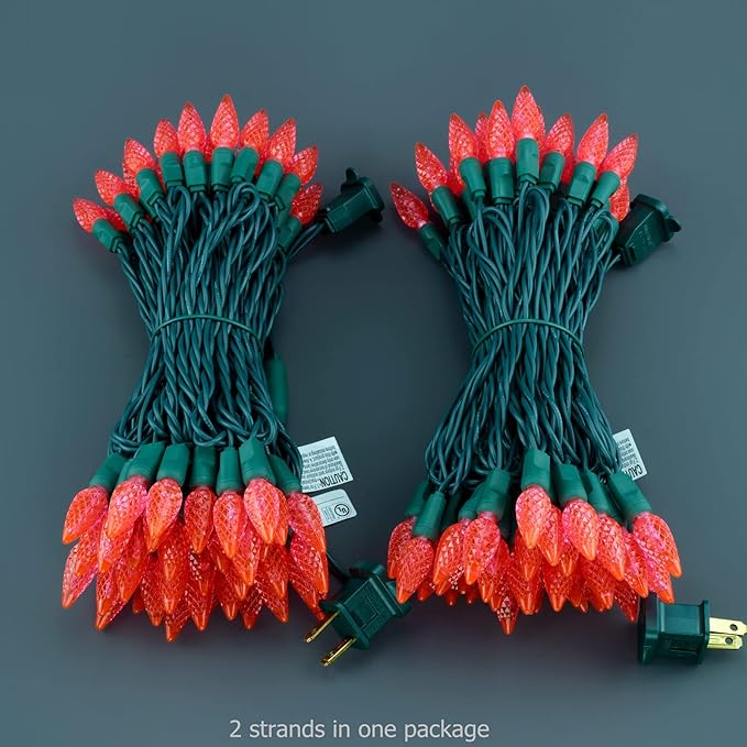 - 2 Strands In 1 Pack ♥ 140 count pink C6 Strawberry LED bulbs on green wire, 71 ft. total length. 2 strands of 70 lights in one package. 35.5-feet per strand, 6-inch spacing, 6-inch lead, 6-inch tail. It can be used with an end-to-end connection or two separate connections as needed.