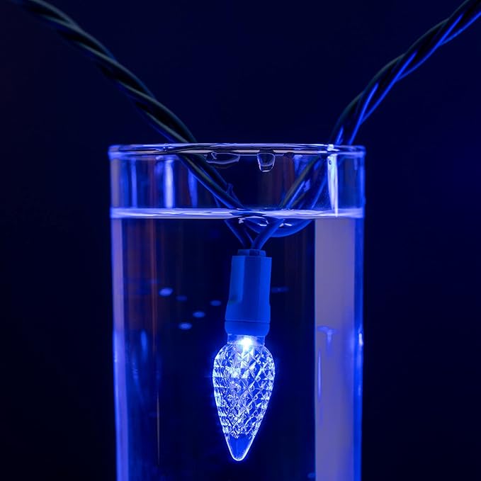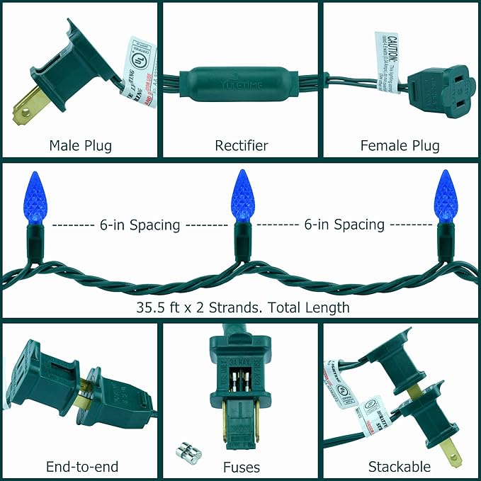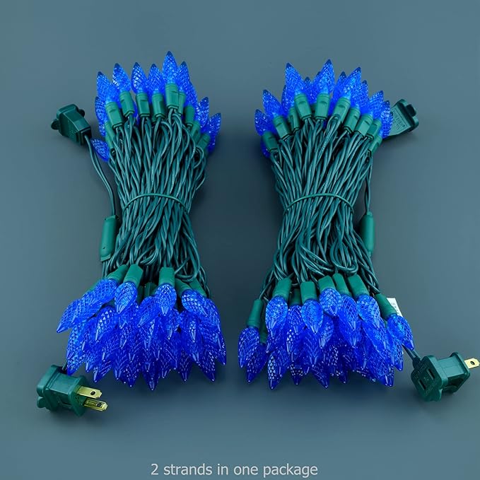 - 2 Strands In 1 Pack ♥ 140 count blue C6 Strawberry LED bulbs on green wire, 71 ft. total length. 2 strands of 70 lights in one package. 35.5-feet per strand, 6-inch spacing, 6-inch lead, 6-inch tail. It can be used with an end-to-end connection or two separate connections as needed.