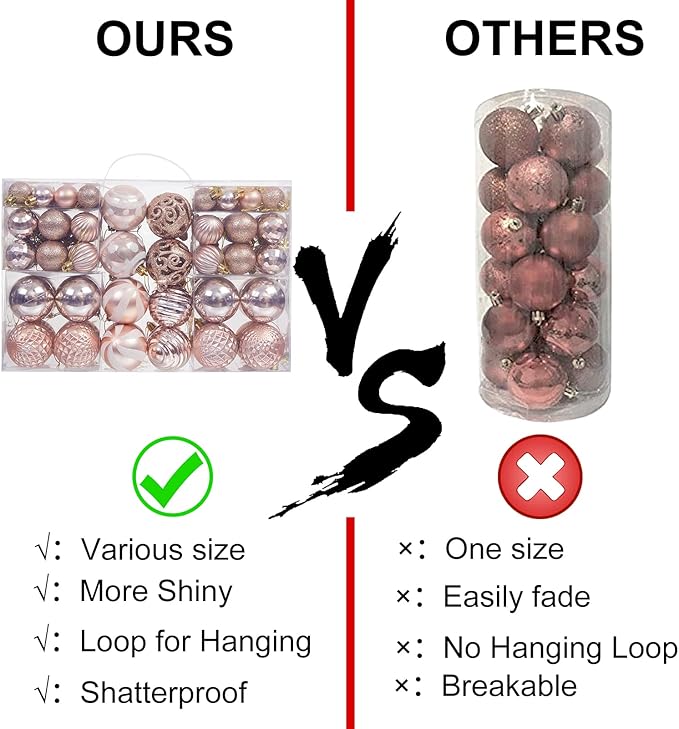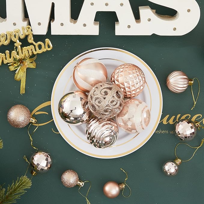 - Charming Design & Colour: This shatterproof Xmas tree balls feature shiny, matte and glitter base. The ball ornaments set has gorgeous painted and hollowed/special-shaped styles.There are 8 colors available. Red and red gold are classic and festive; gold is retro and elegant; silver is modern and noble; rosegold is fashionable and delicate; pink is romantic and warm; black white and black gold are fashionable and individual. You can choose one or multiple colour to decorate your Xmas holiday.