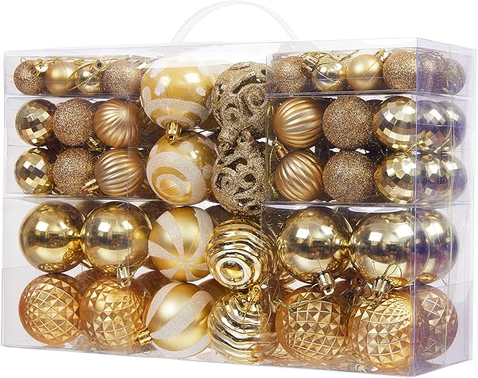 100PCS Christmas Ball Ornaments, Assorted Shatterproof Christmas Tree Decorations, Seasonal Decorative Hanging Baubles Decor Set for Xmas/Holiday/Party, Glitter&Painting Ornament Set (Gold)