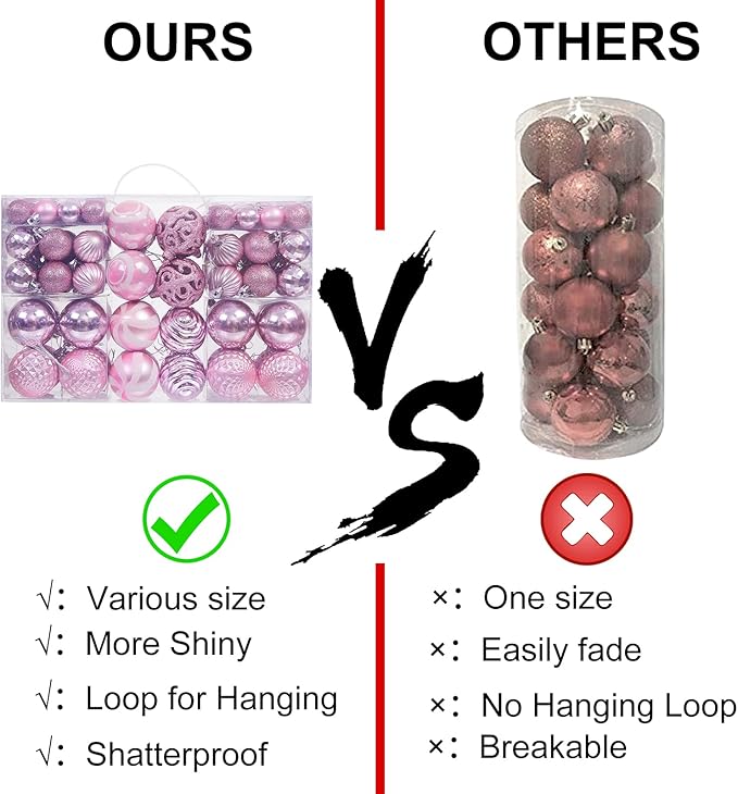 - Shatterproof and Environmental Friendly: Our Xmas tree ball ornaments are made of thick, durable and eco-friendly plastic, with its excellent Shatter-proof effect. You don't need to worry about the ornaments hurt them and glass shards everywhere. Shatterproof design is ideal for families with kids and pets.
