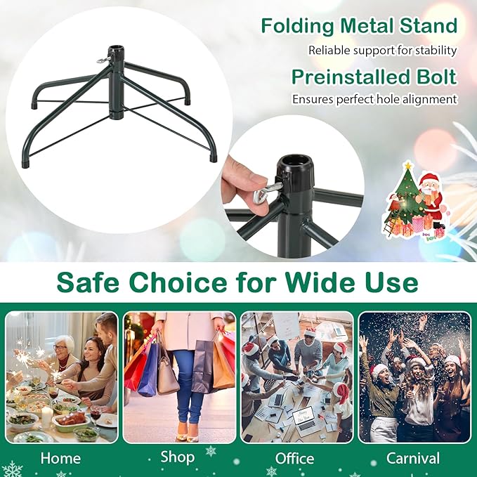 - Easy Setup & Storage: The Xmas tree has a hinged connection for automatic branch expansion and 3 convenient sections for quick setup. The folding metal stand offers robust stability, while the preinstalled bolt ensures perfect hole alignment. 2 pairs of gloves are included to protect your hands.