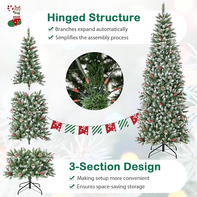 - Vibrant & Snowy Design: The 7ft Xmas tree features 818 snowy, lush branch tips with a lovely bullet-shaped design. Crafted with detail, the tree comes with 40 vivid, natural pine cones and 39 clusters of lovely red berries.