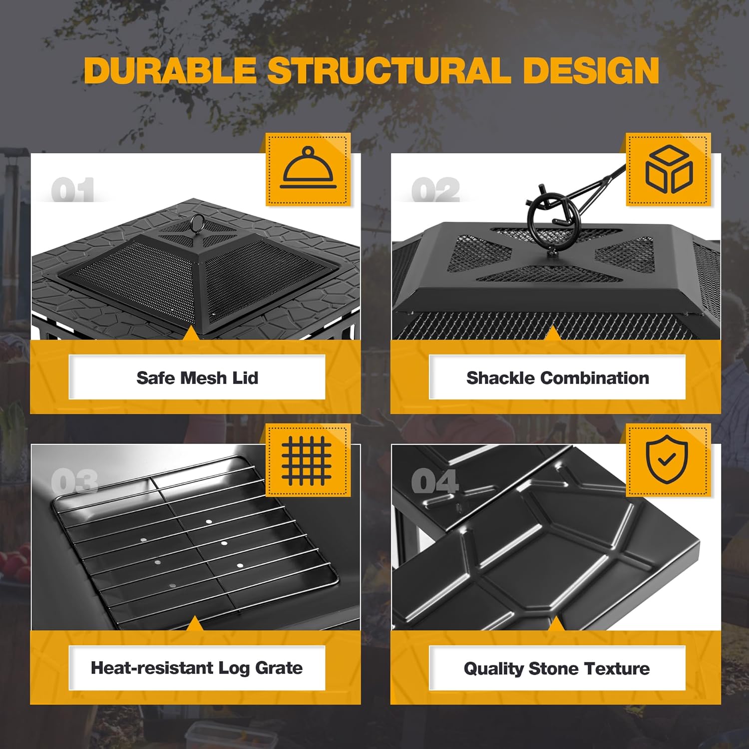 - [ Reliable Security ]: Firepit table features square design with sturdy legs for stability, while the mesh spark screen and poker provided effectively prevent sparks from flying and safely move the grill