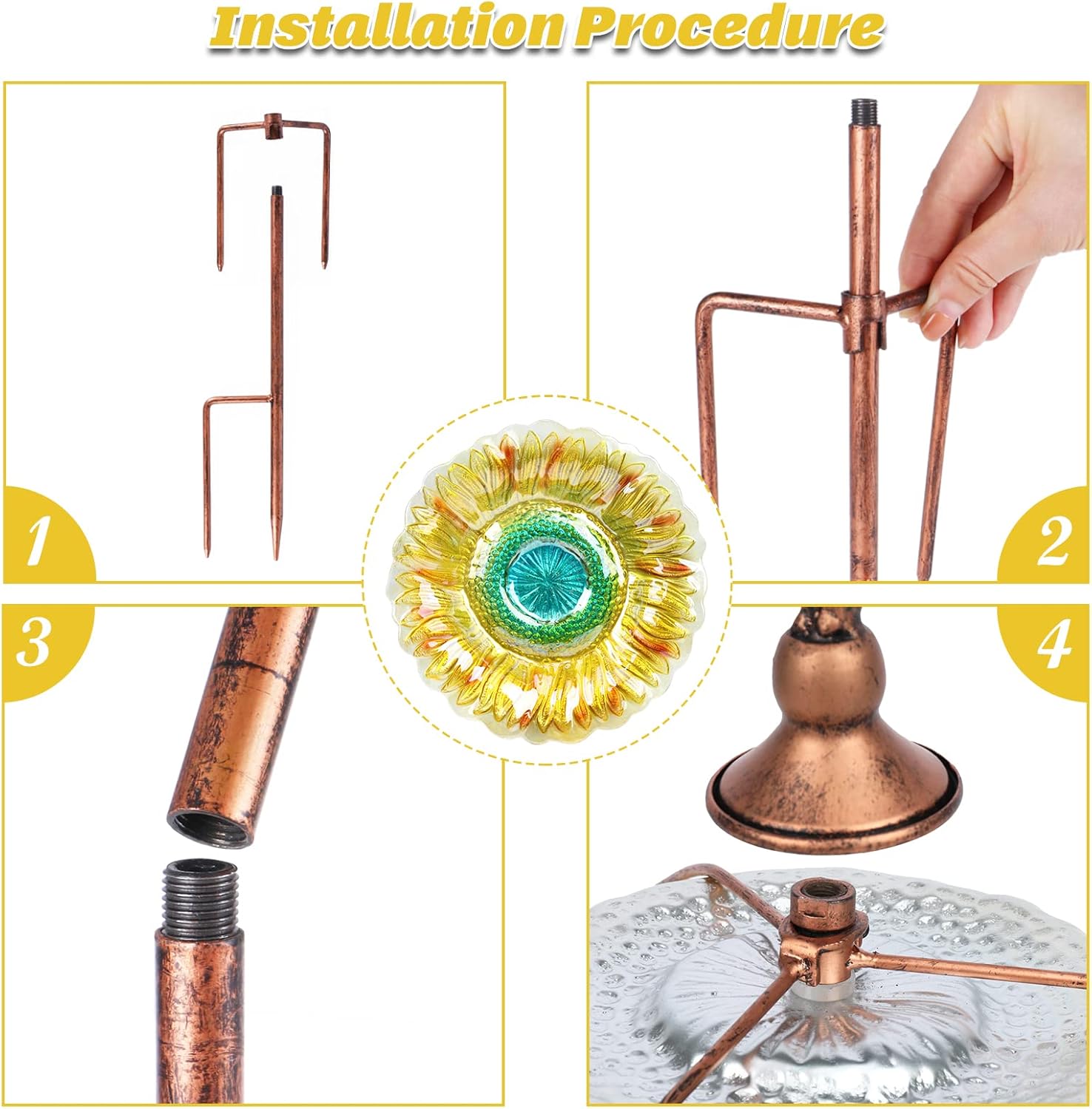 - {Easy To Cleaning} Structure of dish and shallow edges allowing you to clean bird droppings or dirt easily, and get a fresh look. The four stake feet make the glass outdoor bird bath more stable, reduce shaking