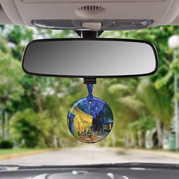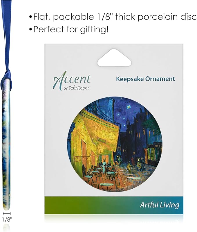 - FINE ART DESIGNS: Artfully designed keepsake ornament showcases van Gogh's famous oil painting, "Cafe Terrace at Night." The design is captured with an artist’s eye for detail, light, and color. Different views of the art appear on the front and on the back.