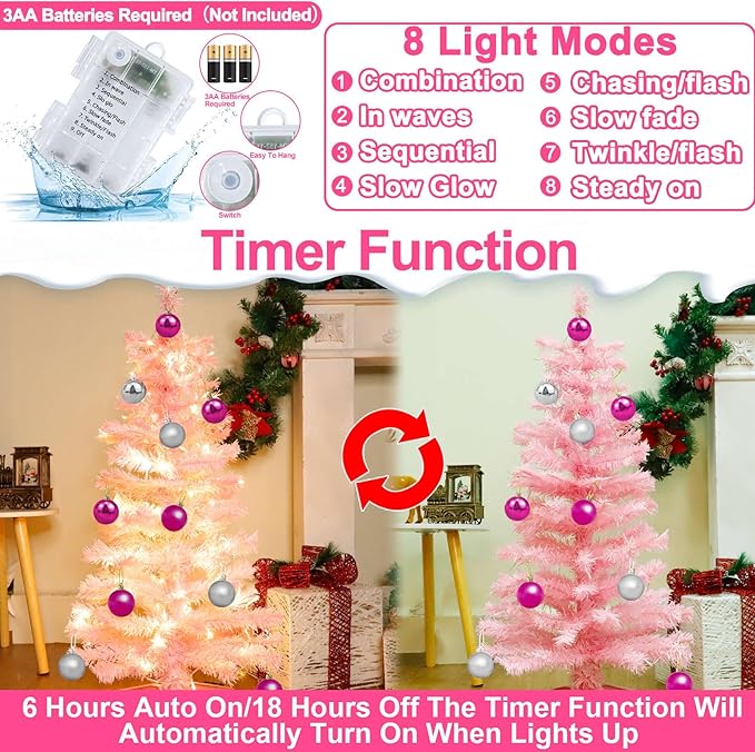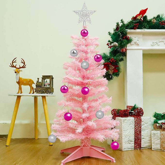 TURNMEON Remote Control 8 Modes 3 Ft Christmas Tree Warm Lights 15 DIY Ball Ornaments Star Battery Operated Artificial Pink Full Tree Timer Holiday Xmas Decoration Home Indoor Table Valentine's Day