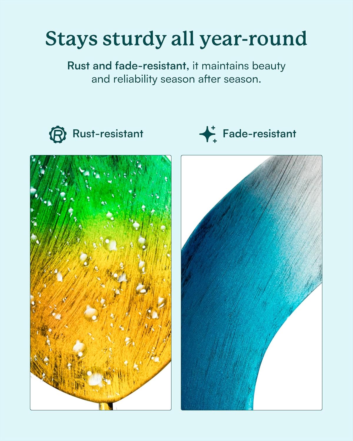 - RESISTANT OUTDOOR METAL DECOR: Made of resistant metal with protective coating finishes. UV, RUST, and FADE RESISTANT. The all-season decorative spinner can be cleaned easily to keep its reflective shine and rustic appearance. Long-lasting use