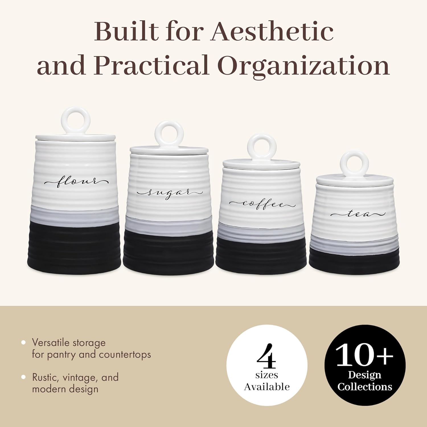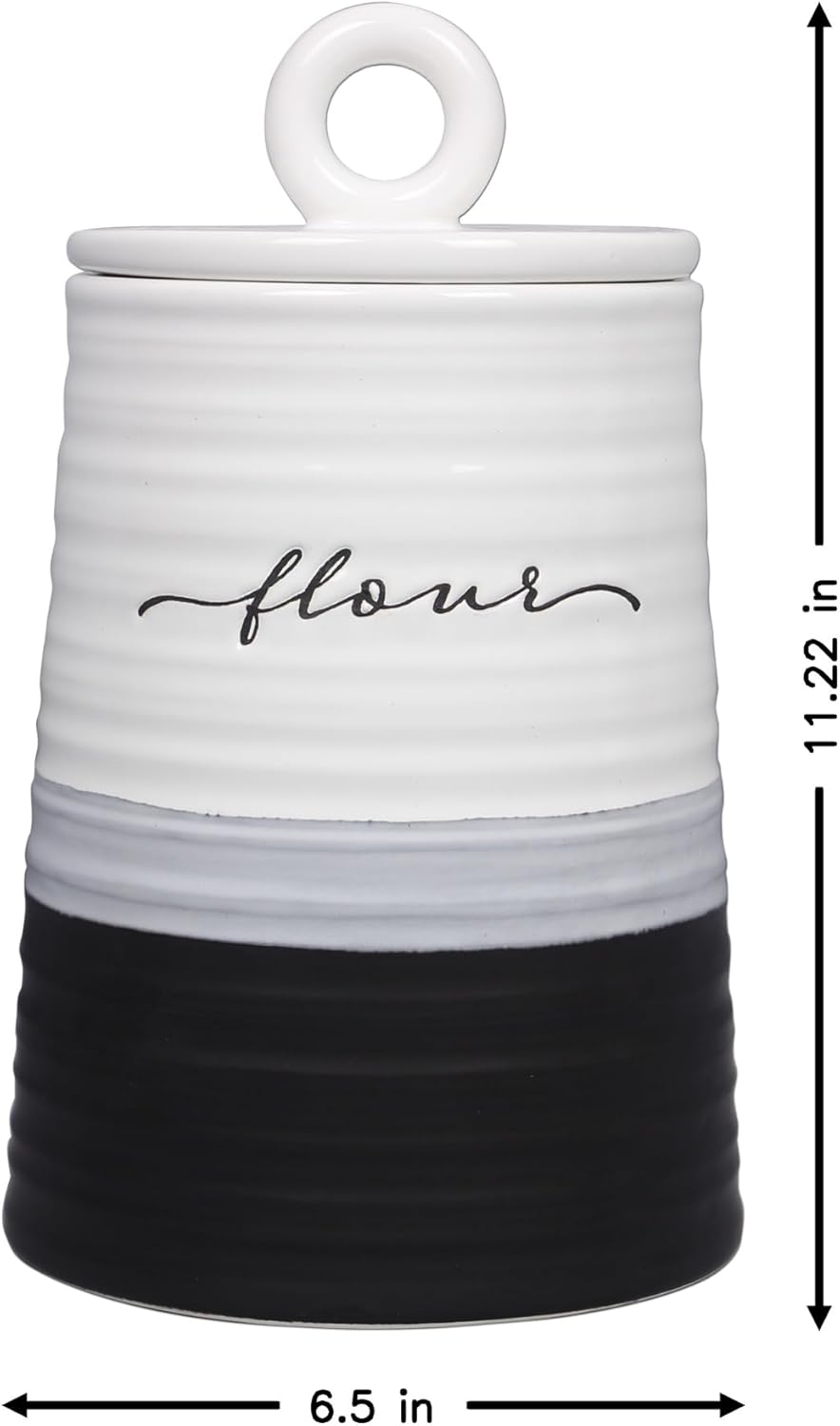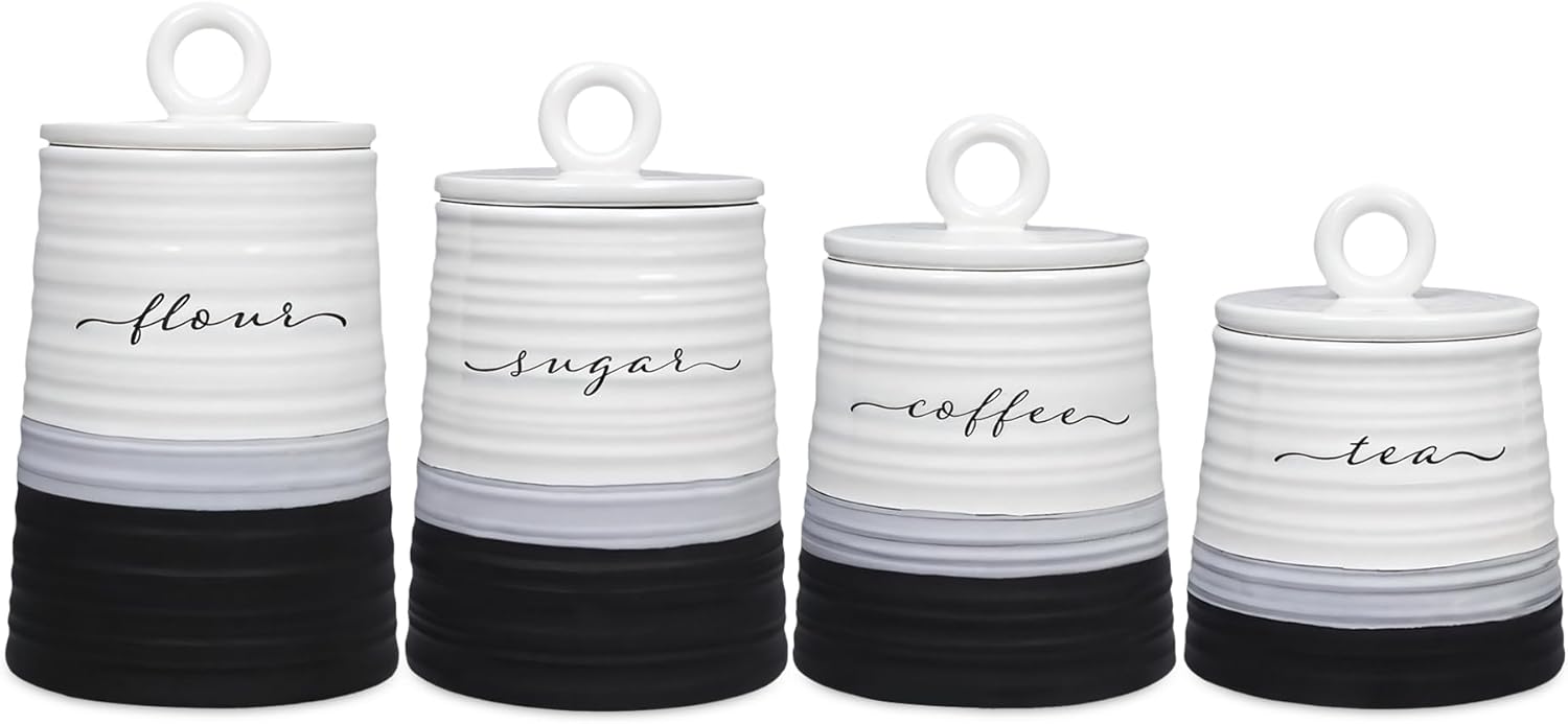Young's Inc. 4 Pcs Set Rustic Modern Ceramic Canisters- Storage Container for Kitchen and Bathroom - Beautiful Home Decor Accent to Store Food, Coffee, Tea, and More - Black, White