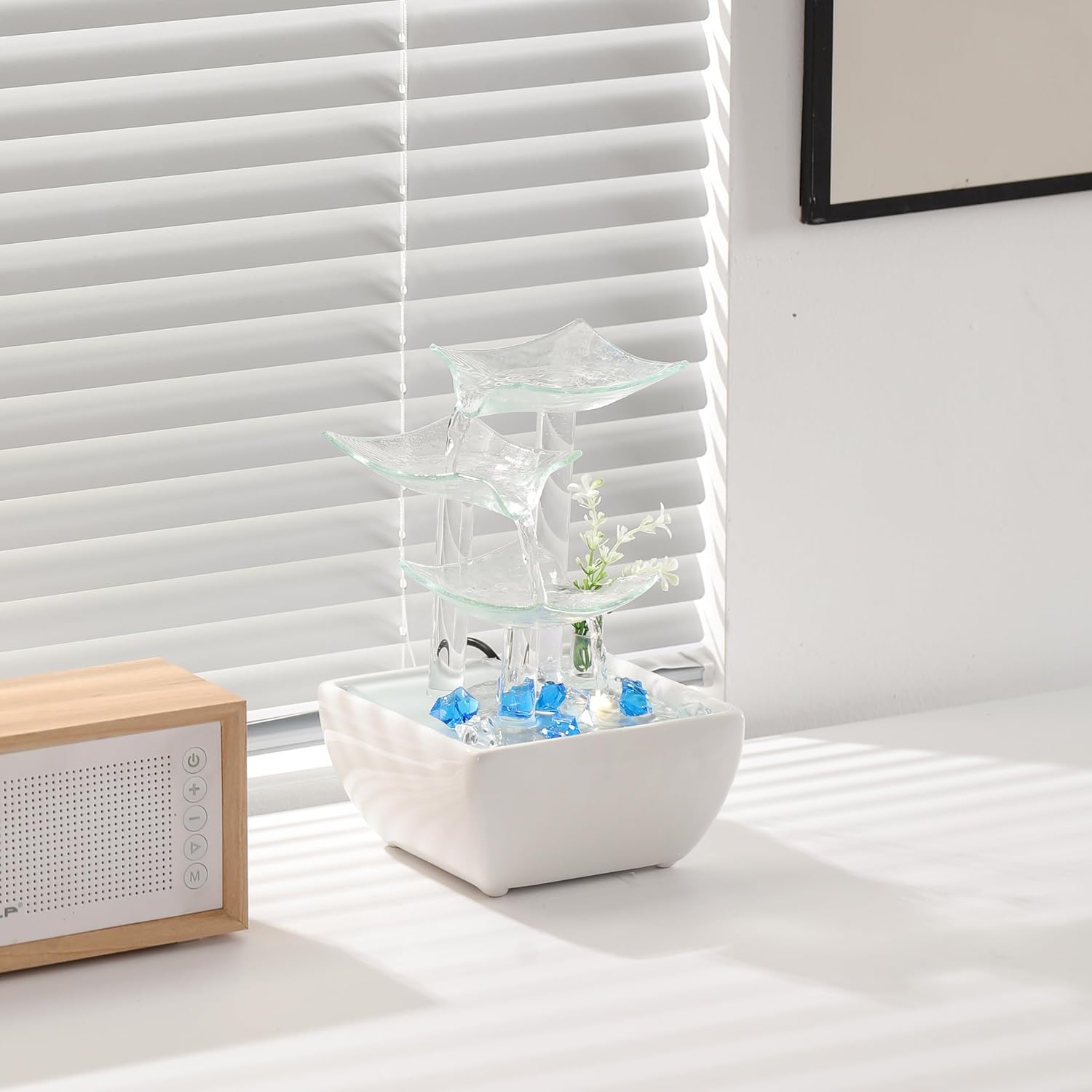 Ceramic and Glass Tabletop Fountain for Indoor and Home Decoration Table Desk Office Patio White