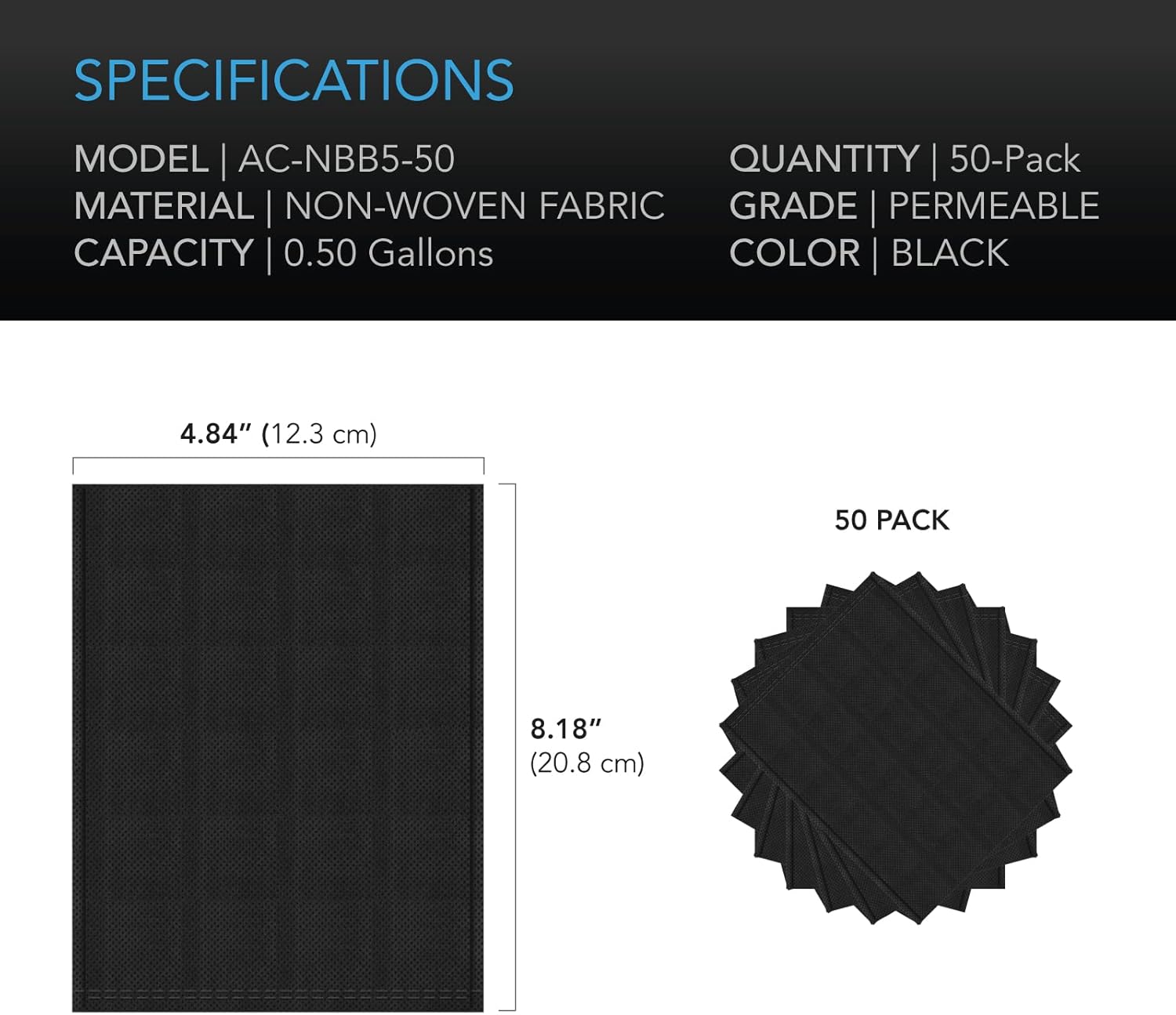 - Capacity: 0.5 Gallons | Dimensions: 8.18 x 4.84 in. | Material: Non-Woven Fabric | Quantity: 50-Pack