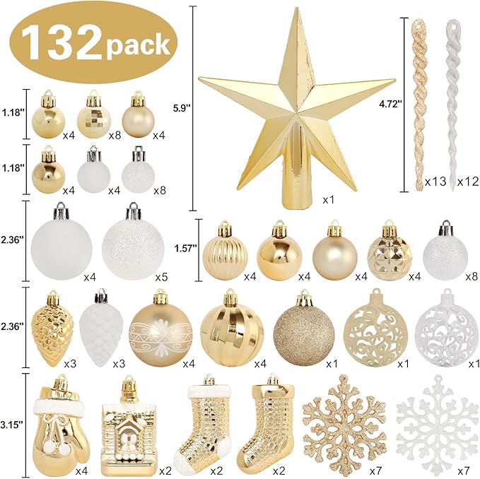 - Perfect Christmas Tree Ornaments Set - The Christmas ornaments set is sold in a 132 pack and contains various shapes, sizes decoration such as Christmas ball, star tree top, Christmas gloves, beautiful house, and Christmas socks, add a great festival touch to your Christmas tree, these white and gold ornaments brings a nice looking for decorations
