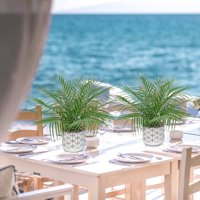 - BOHEMIAN STYLE PLANTER: Topiary plant Total height approx: 15.7", pots: 4.7"W x 3.9"H.The realistic fake palm plants Matt frost gray ceramic vase made of high-quality concrete cement,(the bottom with non-slip pads) fine embossing technique with traditional characteristics, won't fade at all.