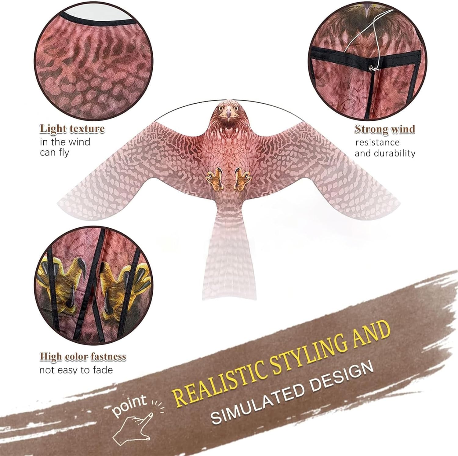 - HOW BIRDS SCARER WORKS: The vibration generated by the bird scarer kite's wings in the wind, as well as the dynamic behavior of flying with the wind, the realistic patterns and colors, have the effect of scaring the birds, without causing them harm. It can protect farmland, Gardens, orchards