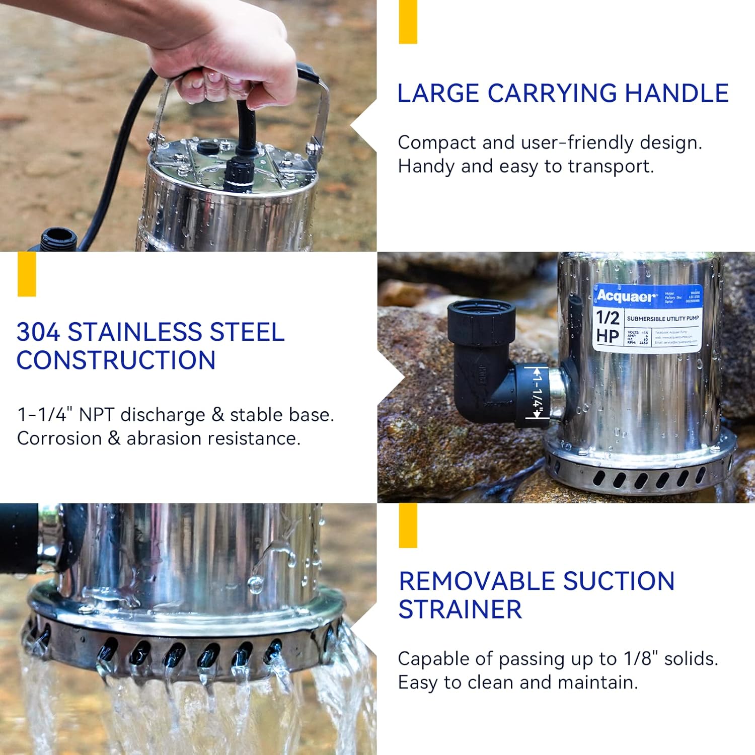 Acquaer 1/2HP Submersible Utility Pump, 3030GPH Stainless Steel Sump Pump, Water Removal for Basement Hot Tub Pool Cover Draining, 30ft Cord