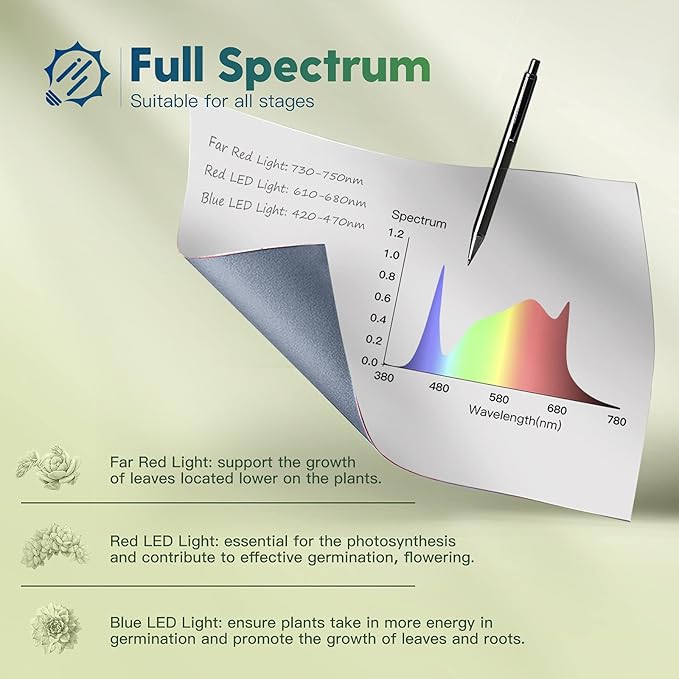 - Sunlike Spectrum: Emulates natural light, ideal for all stages of plant development from seeding to growth and bloom. Add red spectrum to promote photosynthesis.