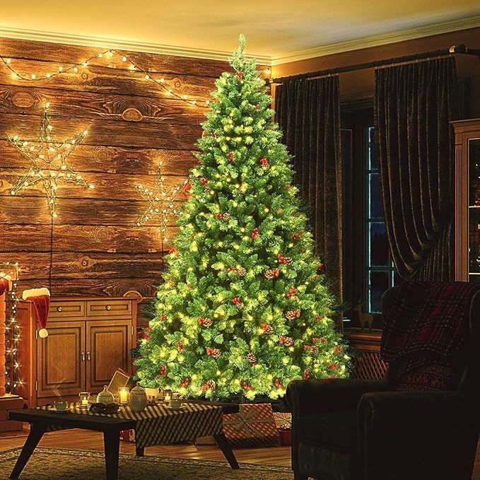 - 【Pine Cones & Red Berries for Dense Appearance】 With 1526 branch tips, the 7.5 ft artificial hinged tree is leafy and fluffy, creating a full and realistic appearance. 73 groups of pine cones and red berries on the tree allow you to embrace the joy of Christmas to your heart's content, adding colorful factors to your living space.