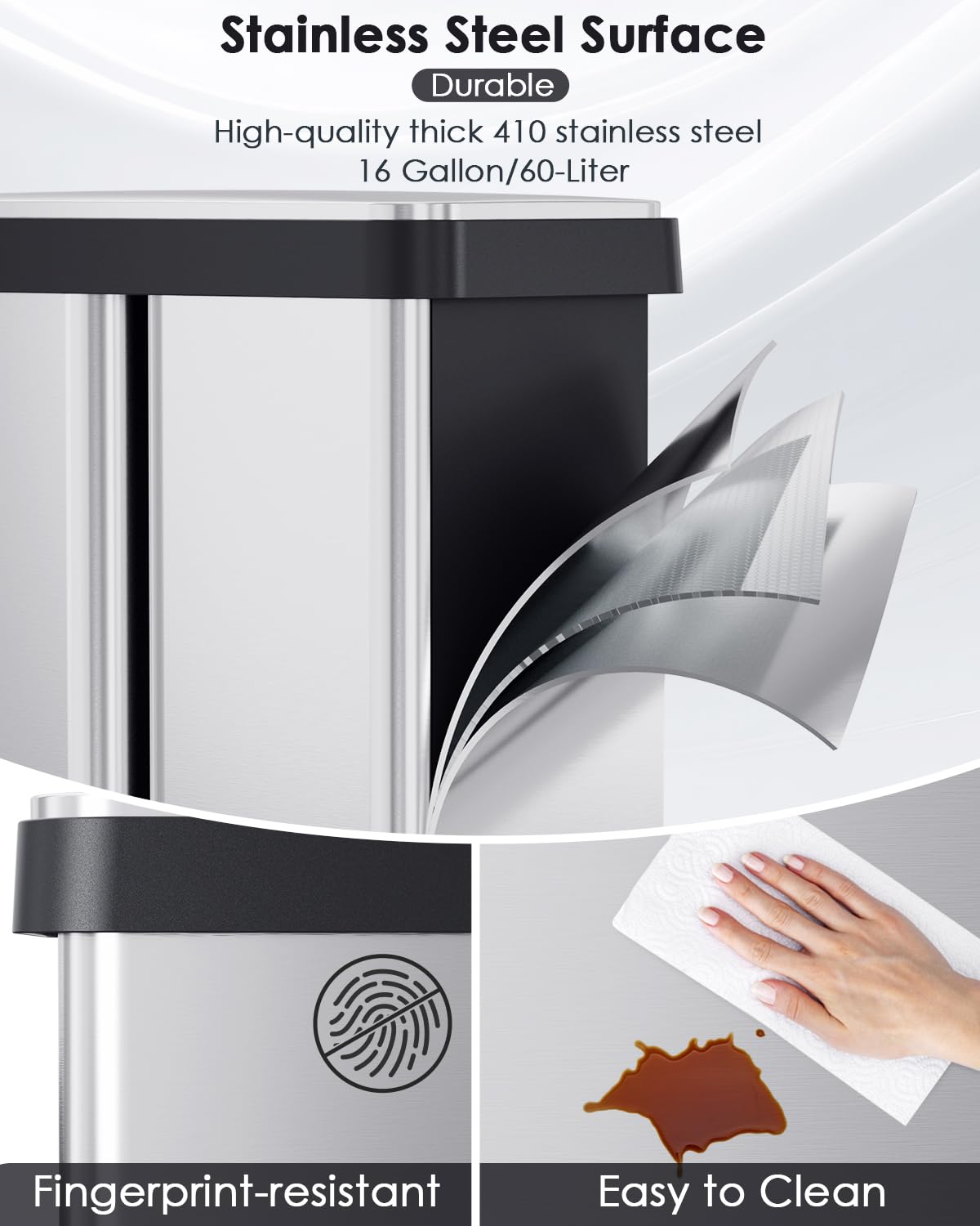 - 【Durable & Smooth】Made of thick 410 stainless steel is durable enough that can use for years. Smooth surface that won't be left a fingerprint and is also easy to clean, just wipe with a damp rag daily to keep your garbage can shiny.