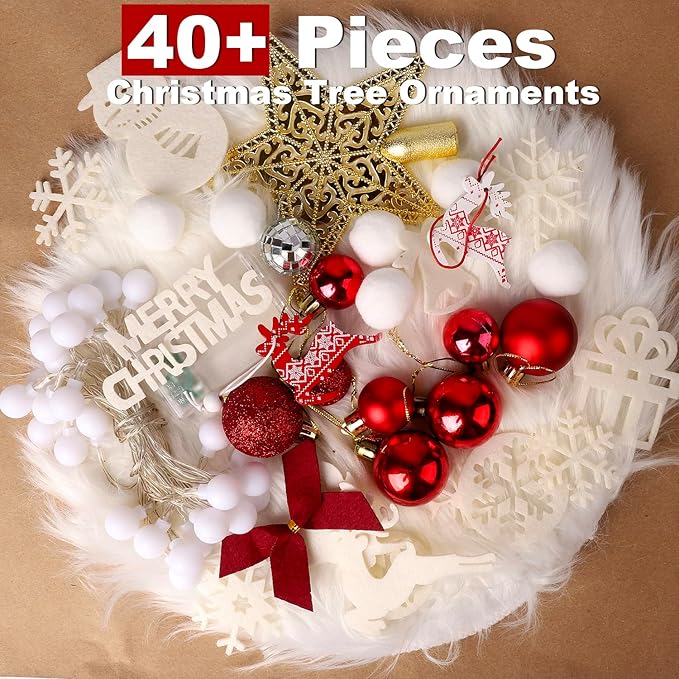 - What You Get: You will get 1pcs 24" small Christmas tree, Including battery operated LED lights, golden treetop star, snow white tree skirts, 40+ pcs ornaments and storage bag. You can DIY a beautiful and charming mini Christmas tree!