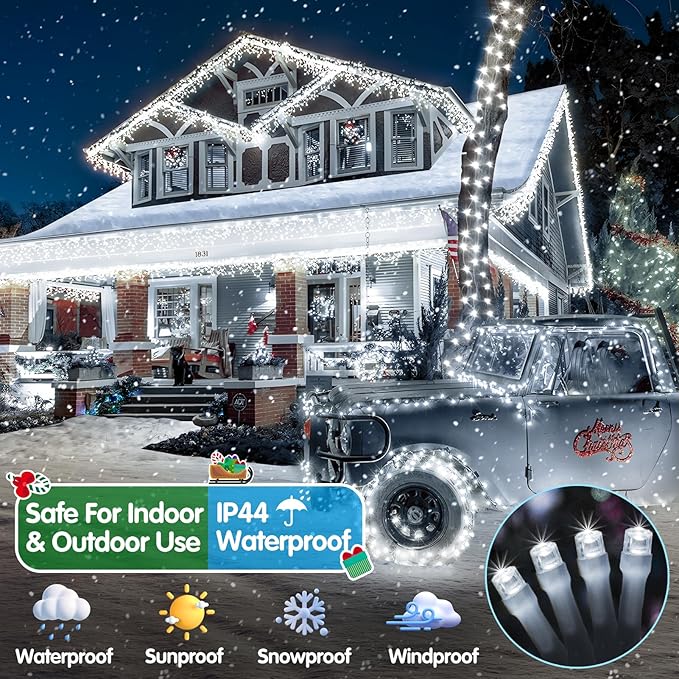 - 8 Modes and Waterproof: Christmas lights outdoor offer 8 lighting modes and are designed for winter with waterproof, anti-freeze. Mini LED bulbs with hot melt adhesive ensure durability. Perfect in heavy rain and snow, just keep the plug dry