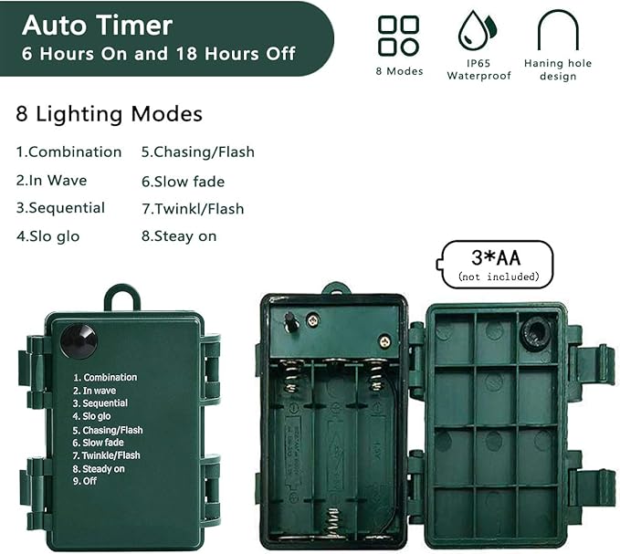 - 8 Lighting Modes: Combination, In waves, Sequential, Slow Glow, Chasing/Flash, Slow fade, Twinkle/Flash, Steady on. Adjust the lighting modes by pressing the round button on the battery box to satisfy your diverse needs. Create elaborate light displays for many holiday seasons and other events with these brilliant lights