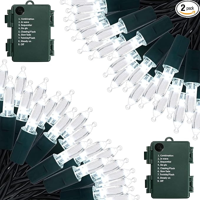 - LED Bulbs Mini Christmas Light: Cool White 2 Pack 50 LED bulb cone shape reflects light in all directions creating a spectacular halo of light. Great choice that allows maximum flexibility and great eye appeal. String Lights: 16ft, Leading Wire: 1ft, the total length of each battery powered string lights is 17ft