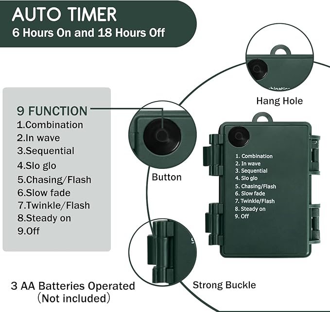- Durability & Energy Saving: Our LED lights save you money and make string lights safe for the whole family. These energy efficient LED Christmas lights add splendor to your home or yard as you prepare for the holidays. Also comes with built-in auto timer function(6 hrs ON, 18 hrs OFF), to avoid forgetting to turn off the Christmas lights