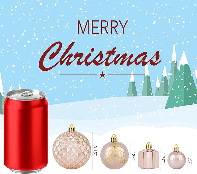 - 【Christmas Ball Ornaments】 This rose gold assorted Christmas ornament set contains 116PCS of Christmas balls in 18 styles, includes various shapes, sizes, such as 1.57” / 2.36” / 3.14” Christmas ball, stocking , bell, and gift. It's your call to complete your Christmas decoration with these beautiful balls ornaments set, and make the Christmas season more memorable and unique