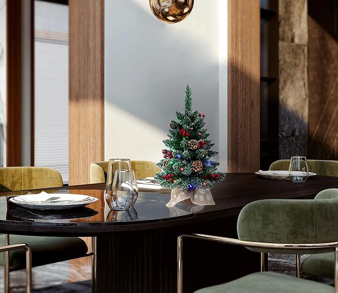 - 【Distinctive Design】-(1)Pefect Size: The overall height is about 24 inches, just approximately equal to 2FT(60cm). (2)Blend 3 Christmas Primary Colors: Green tree, red berries, top point of every leaf is sprayed into white color. At the same time, 4 Colors String Light can bring more coordinated colors and fun. (3)Nice Appearience: The top point of every leaf is sharp and sprayed into white, stand base is wrapped up in picture cloth bag.The distinctive appearience integrate these abundant colors, make the mini Christmas tree look nice. (4)8 Modes Lights: The prelit lights has red, green, yellow, blue 4 colors and it can working in 8 modes. So the tree is applicable to more scenarios.