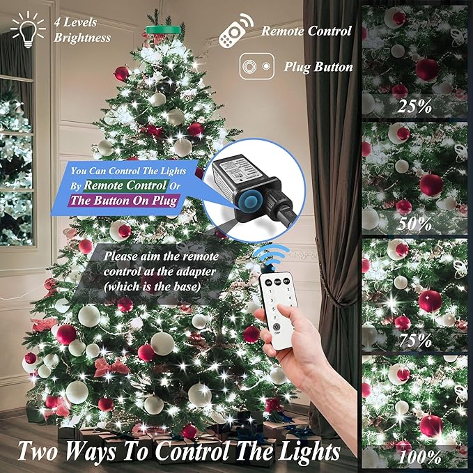 - 🎄【8 Lighting Modes & 4 Levels Brightness】aneeway Christmas tree lights are available in 8 different lighting modes(Use remote control or press the button on the plug to switch the light modes). And the string lights have 4 levels of brightness (25%, 50%, 75%, 100%) for choice. A variety of blinking modes and brightness bring different light effects, which will make your Christmas tree and holiday more atmospheric!