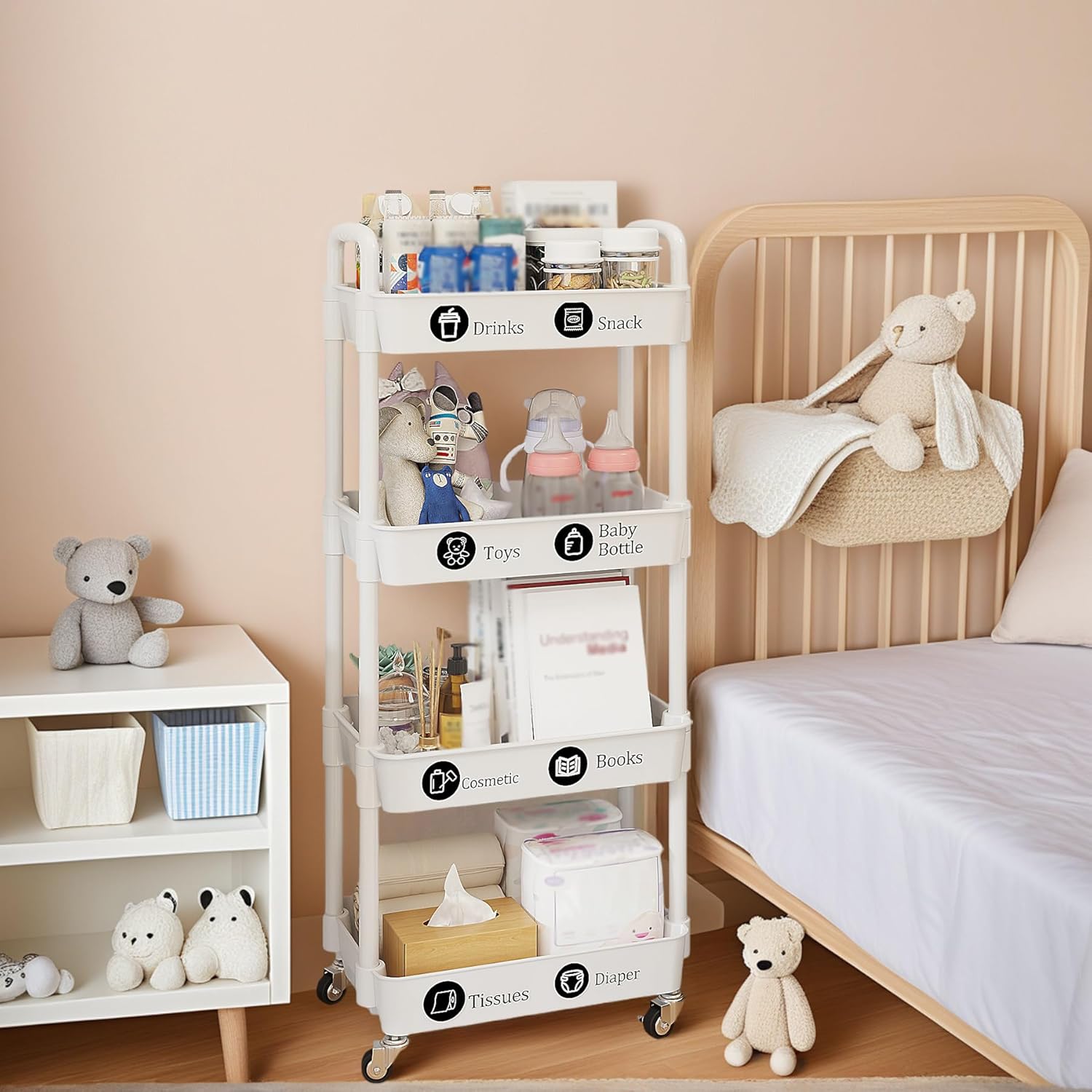 UDEAR 4-Tier Rolling Utility Cart with 12 Category Labels,Multifunctional Storage Shelves with Handle and Lockable Wheels for Room,Office,Kitchen,Bathroom,White