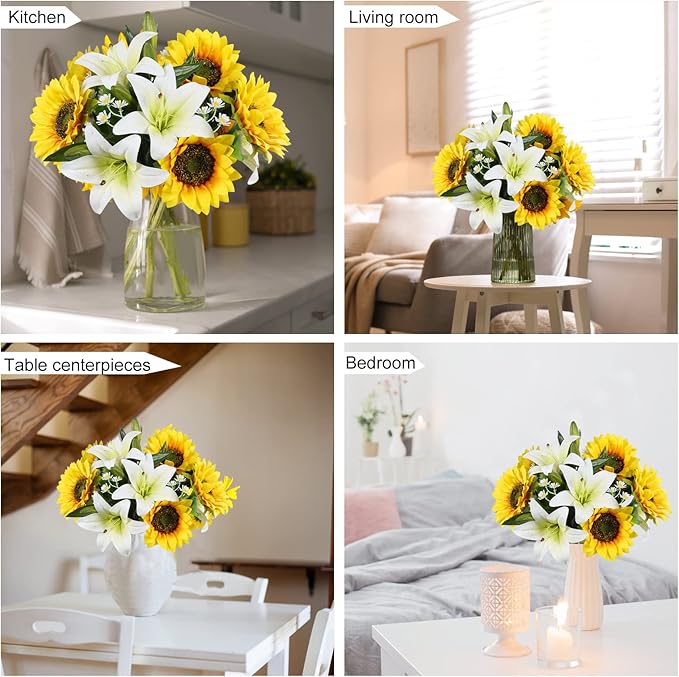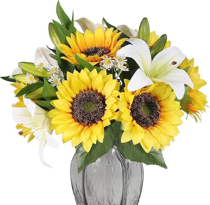 - Realistic Appearance: These faux sunflowers with lilies are full blooming and colors were bright and vibrant. Perfect silk floral arrangements for home fall decorations.Ideal autumn gift ideas for your family or friends