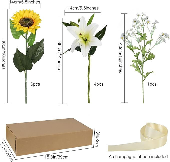- Summer Flowers Bouquet Includes: This artificial flower -Total 11 pieces come in a pack - 6pcs fake sunflowers, 4pcs white tiger lilies artificial flowers, 1pc daisy and a champagne ribbon (no vase), plastic stems and some decorative leaves. The height of the fall floral bouquet is about 16inches