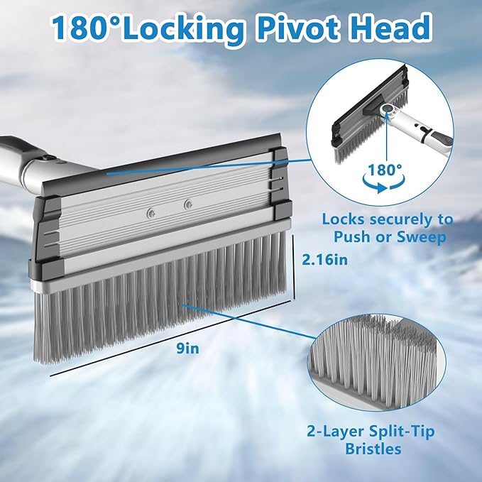 - 🧹 SWEEPS LIKE A SNOW BROOM, PROTECTS LIKE A BRUSH: Engineered to capture the high-volume clearing power users demand from a snow broom for car. The 180° Pivoting Head locks into horizontal positions, acting as an effective snow cleaner for car surfaces and snow pusher to clear heavy wet snow instantly. Unlike foam heads that can tear, our high-density flagged bristles offer superior durability while maintaining a soft touch.